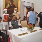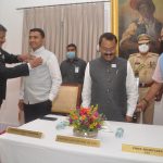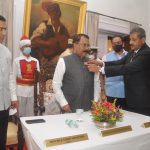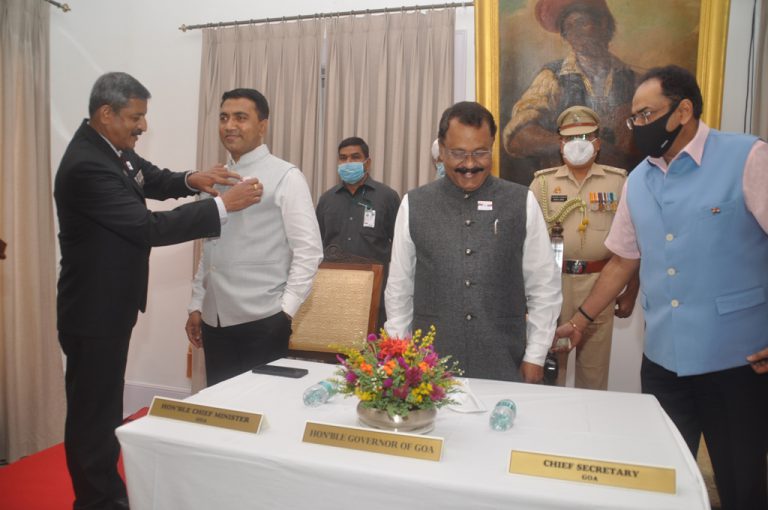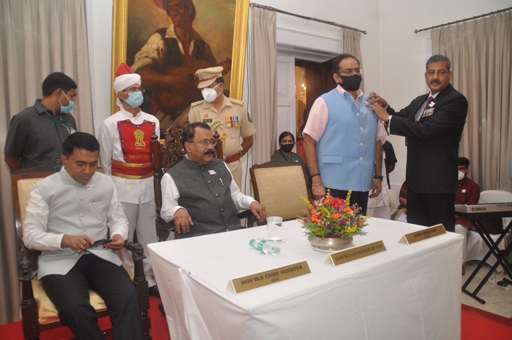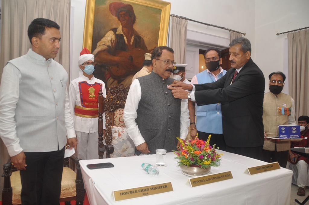 Hon. Chief Minister, Dr. Pramod Sawant is being pinned the Armed Forces Flag Day Flag by Secretary, Dept. of Sainik Welfare on the occasion of Armed Forces Flag Day.