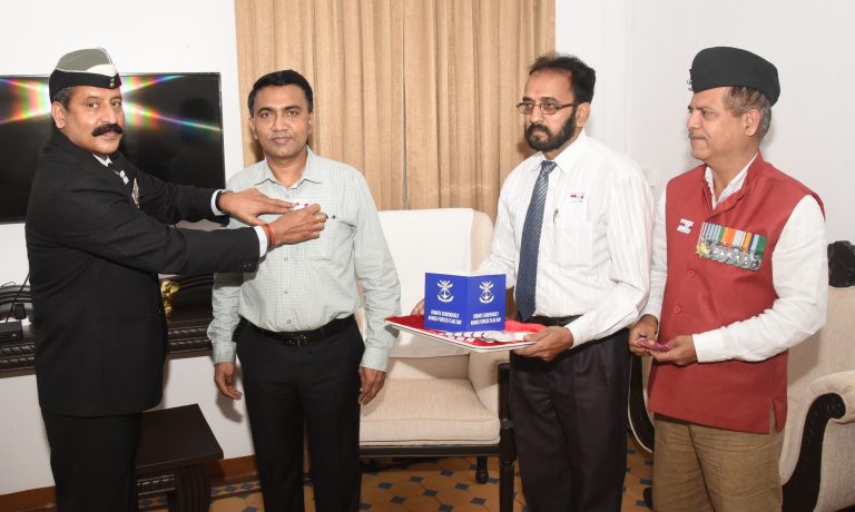 Hon. Chief Minister, Dr. Pramod Sawant is being pinned the Armed Forces Flag Day Flag by Secretary, Dept. of Sainik Welfare on the occasion of Armed Forces Flag Day, 07 Dec 2020